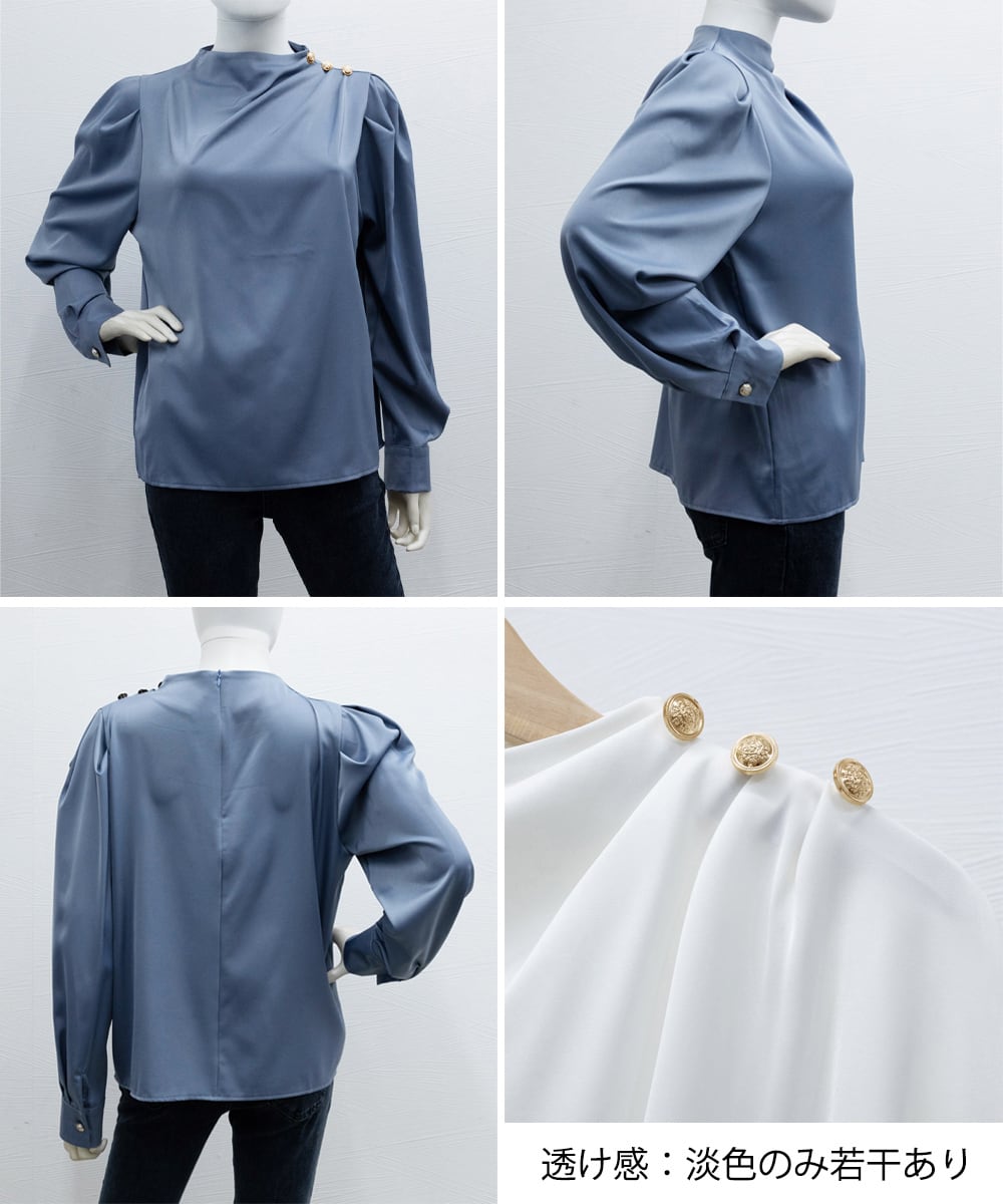 肩のタックとボタンが目を惹く、女性らしいスタイリングにぴったりなブラウス