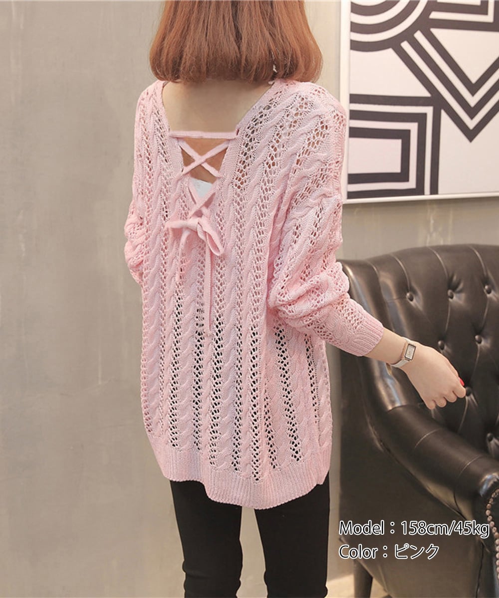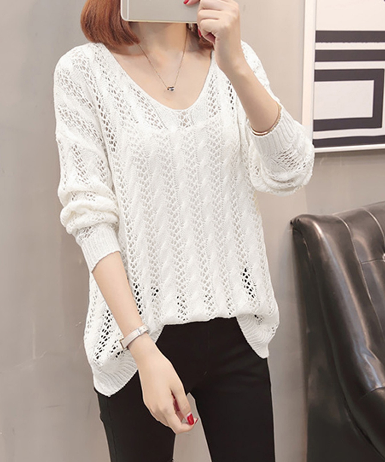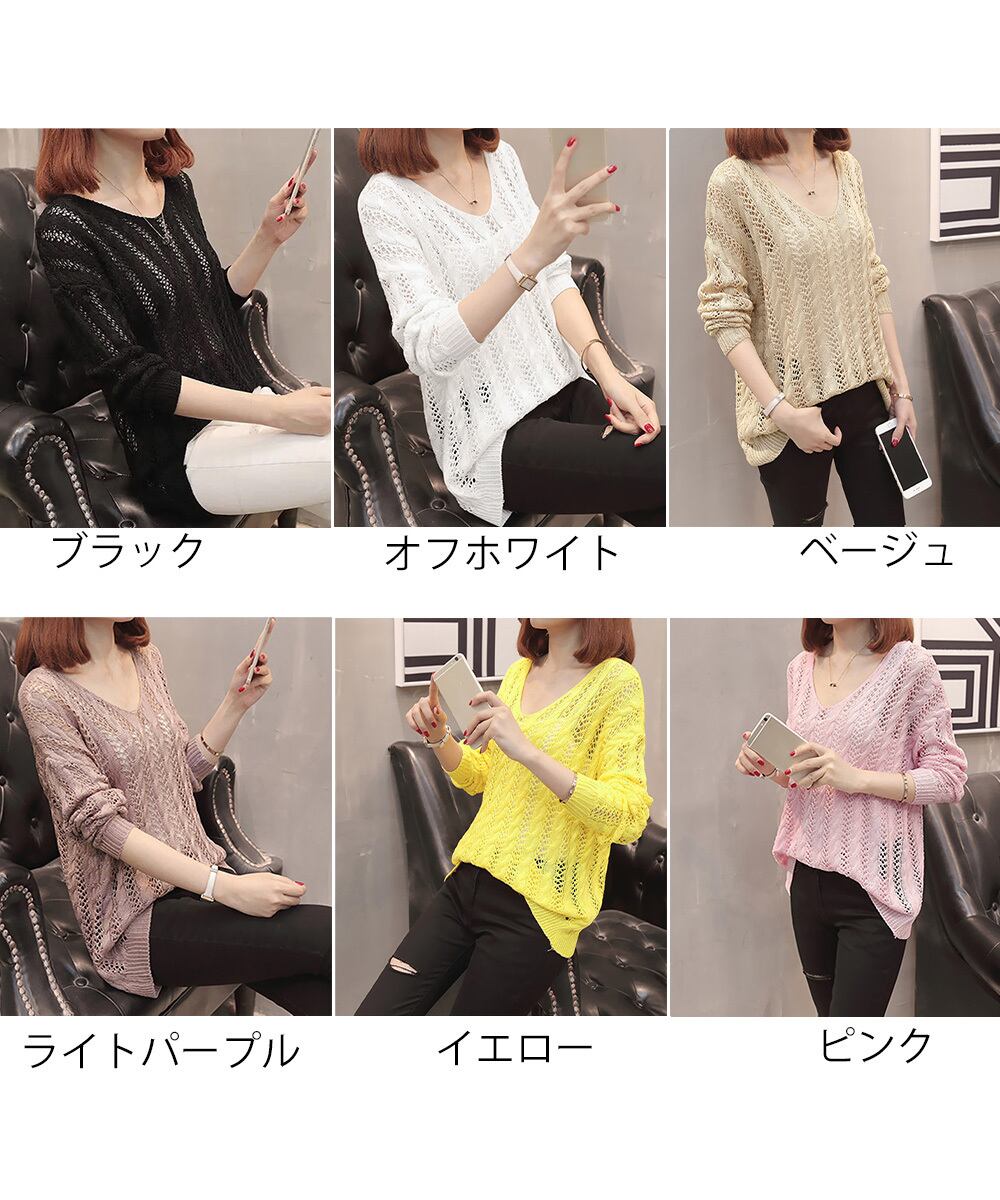 レディース Vネック クロシェ編み ニットプルオーバー ゆったり サマーニット 体型カバー 長袖メッシュニット セクシー