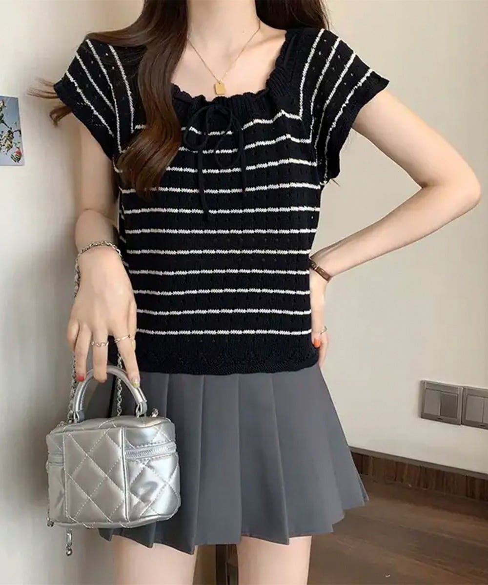 ボーダー柄サマーニット レディース ニットソー 薄手ニットTシャツ 大人可愛い ガーリーニットプルオーバー おしゃれ夏服
